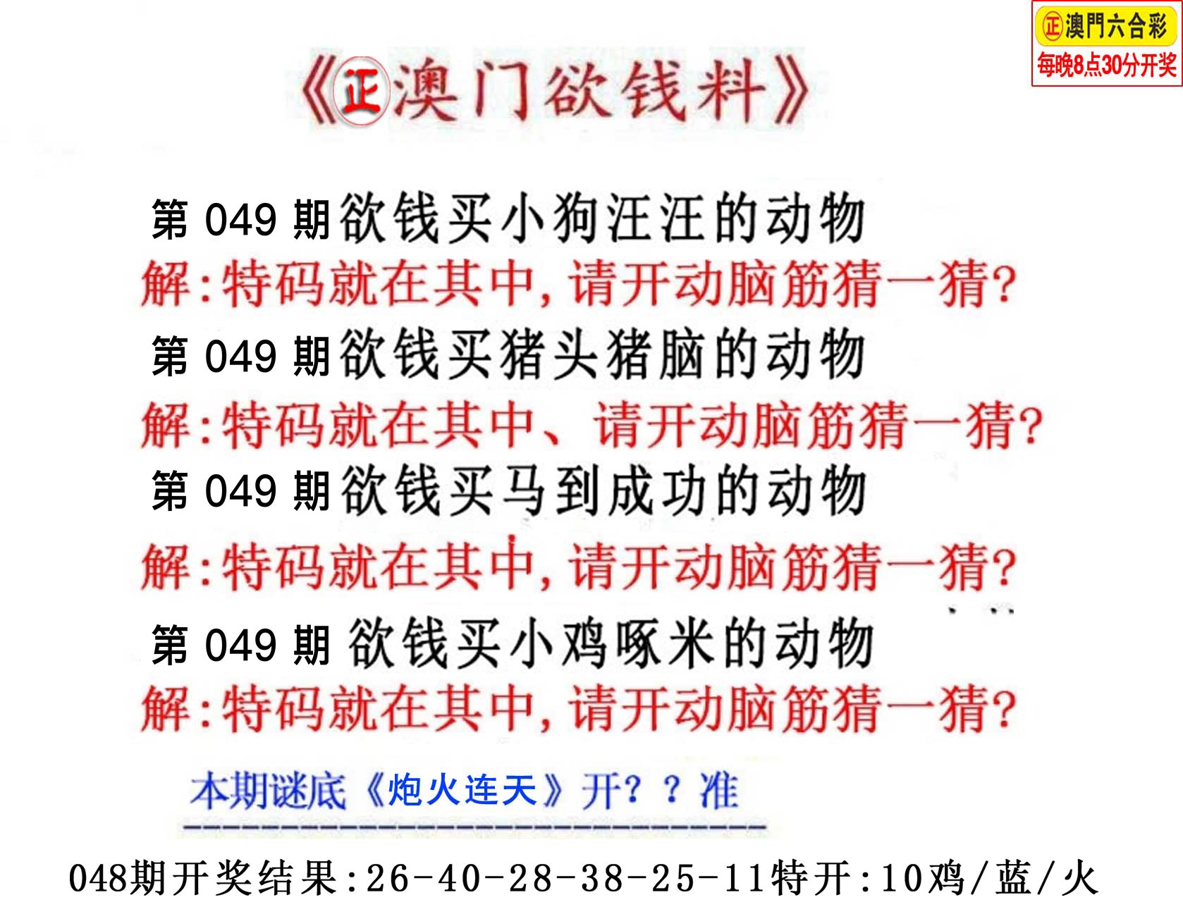 四肖:鸡狗马虎